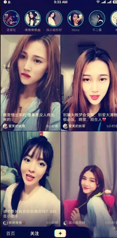 用户可以向主播申请连麦,用户的声音可以在直播房间显示,最多支持一个主播同时连麦三个用户。用户还可分享当前视频到微博、微信、朋友圈、QQ等社交平台 美颜+镜头设置+音质调节: