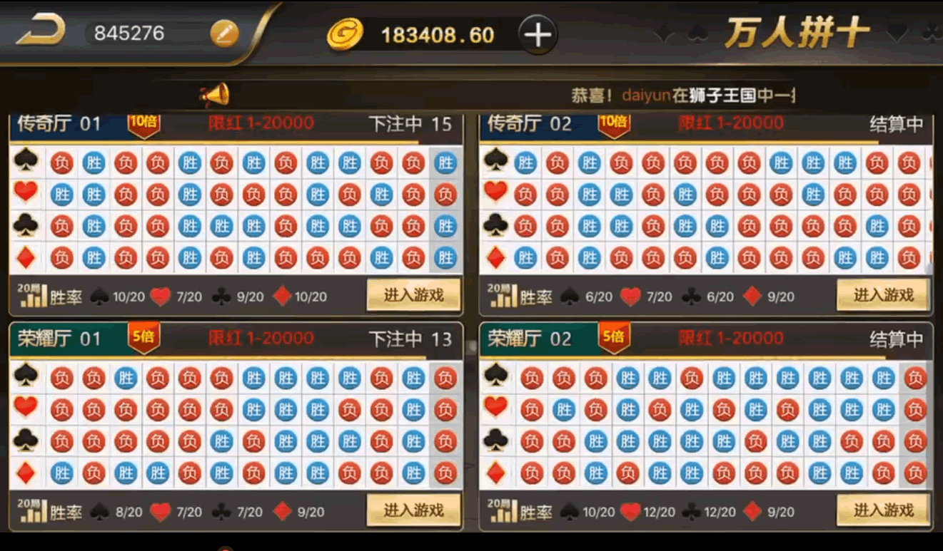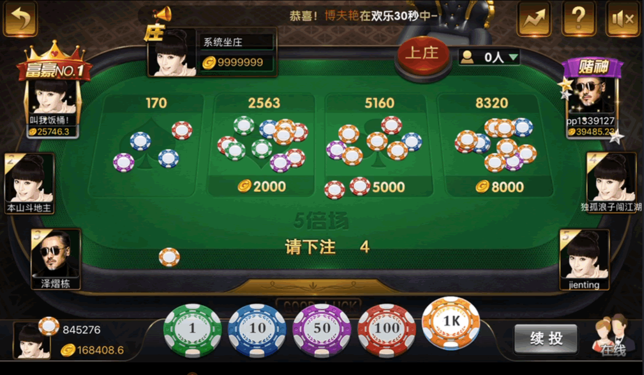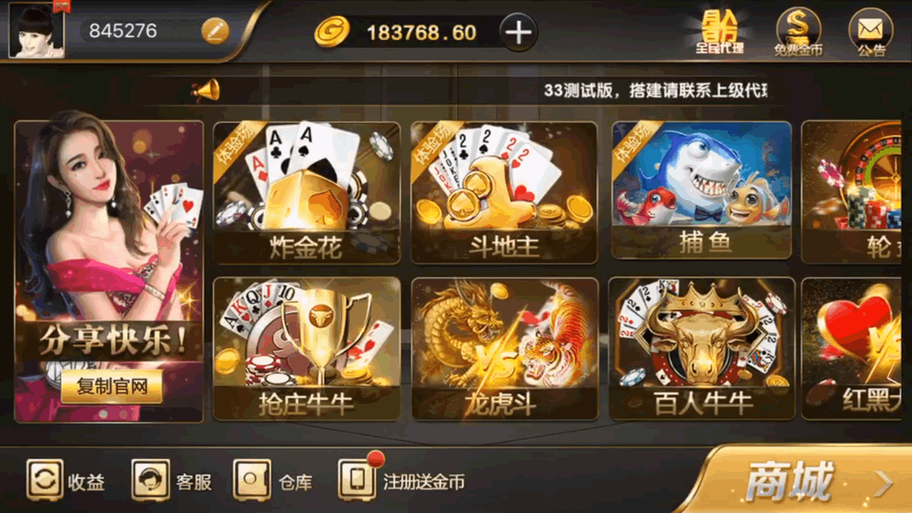 游戏列表:炒金花、抢壮牛牛、斗地主、龙虎斗、钓鱼大亨、百人牛牛、快跑、红黑战、二十一点、狮子王国、十三水域、百*乐、三工、奔驰宝马、八巴、碳化硅博、水果机、轮盘赌等。一共有18个子游戏每个子游戏都配有控制器。有三种控制模式,即玩家单一控制、前端控制和库存控制。具体控制模式参见永利国际象棋的控制模式。游戏登录注册方法:玩家登录,微信登录,手机注册