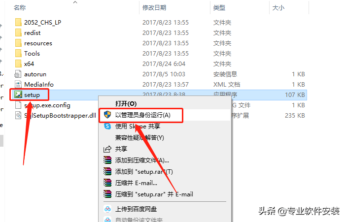这样java基础环境就安装好了,下面来安装主程序。sql_server_2017.iso,可以用光驱装载,也可以直接双击打开,然后.鼠标右击【setup】安装程序,选择【以管理员身份运行】