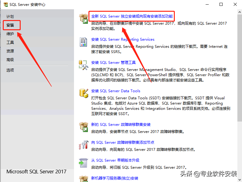 点击【安装】,然后点击【全新安装或向现有安装添加功能】