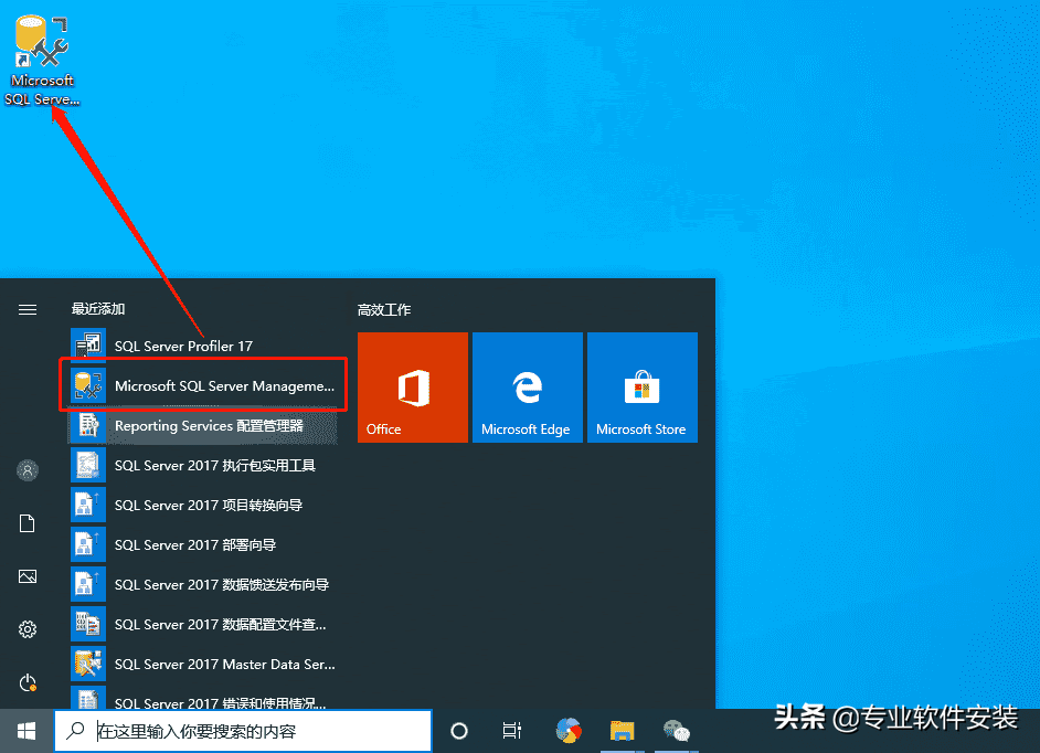 好了,这样我们的数据库就全部安装好了,接下来,我们点击桌面左下角的开始菜单,然后找到【Microsoft SQL Server Management···】,鼠标拖拽到桌面上创建快捷方式