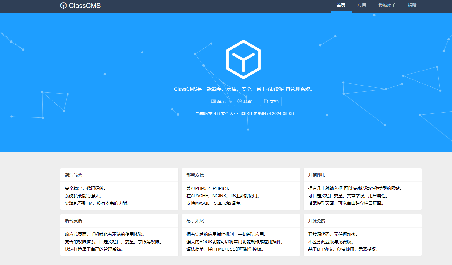 ClassCMS 兼容 PHP5.2 至 PHP8.3,可在 APACHE、NGINX、IIS 等多种服务器上使用,支持 MySQL 和 SQLite 数据库。