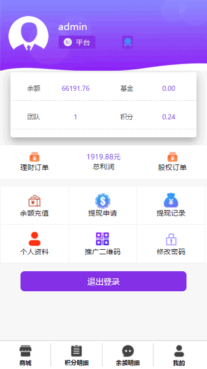 4. 升级为代理 获得伞下会员每1200元/份的400积分奖励每天0.0025递减返现奖励。后台奖励与百分比可自定义