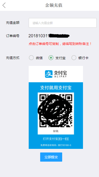 6. 充值为二维码充值,前台扫码充值时,随机生成一个订单号,填写到转账备注,后台审核通过自动到账。(可以选择三种充值方法,1、微信 2、支付宝 3、银行卡。需上传对应的二维码)注:可生成充值订单号有,有利于查看。