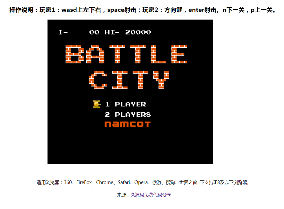 坦克大战游戏源码HTML5经典,站长测试了一下,运行正常,不用安装,直接用浏览器打开index.hmtl文件就可以玩了。