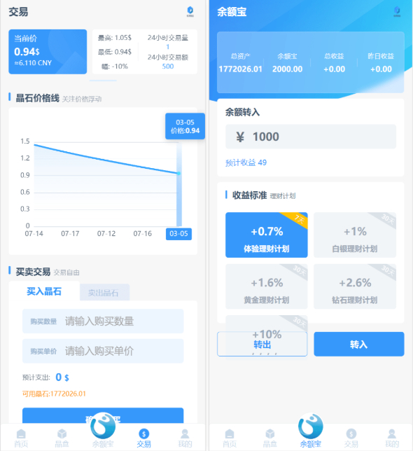 功能还算完整,UI也还不错,带有余额宝理财、虚拟币交易市场等功能,还内置了layim在线客服,可以正常发文字聊天,但是不能发图片
