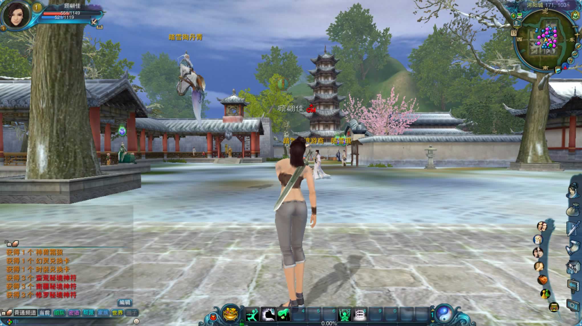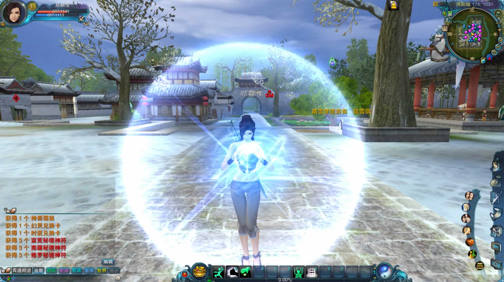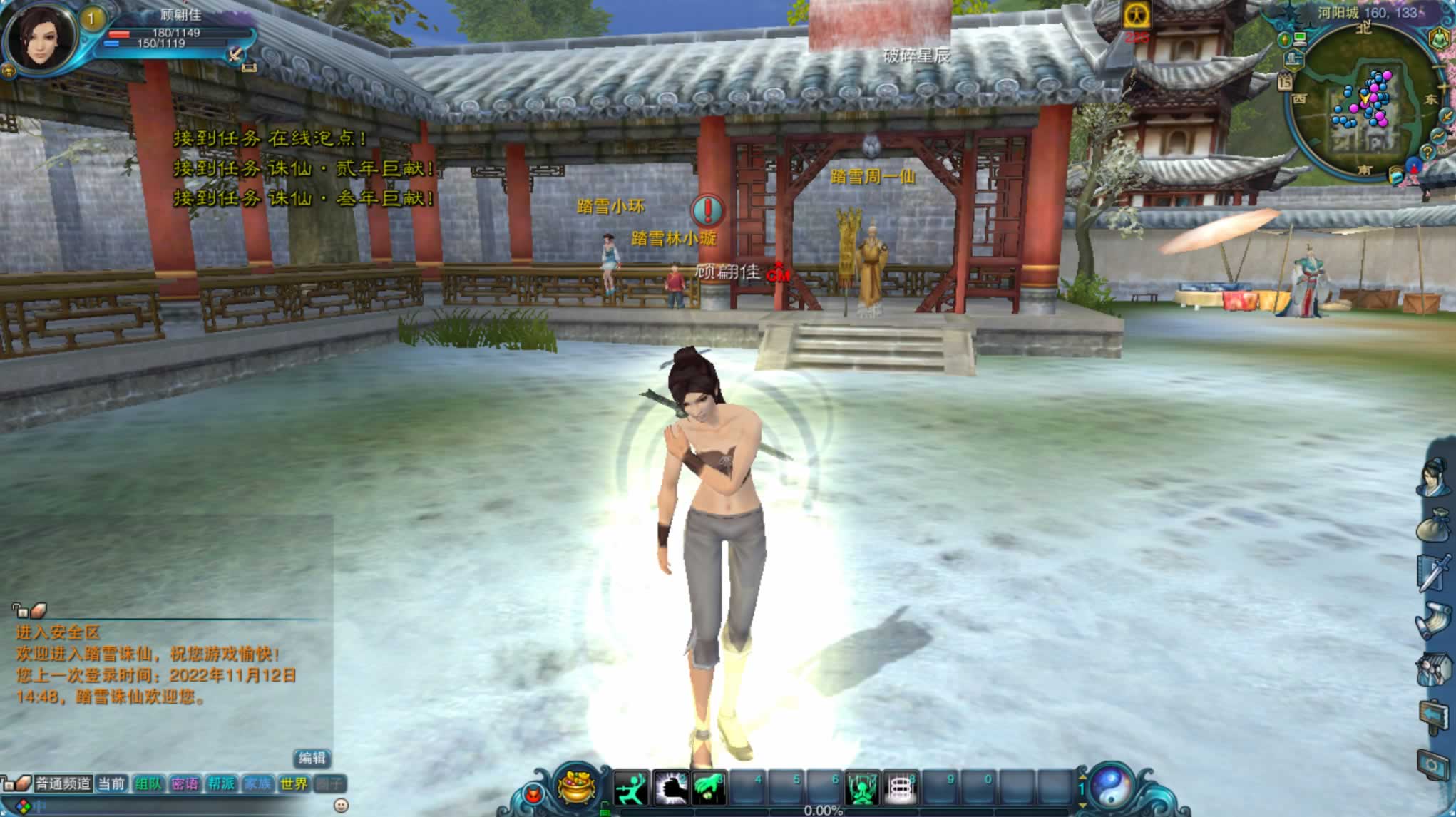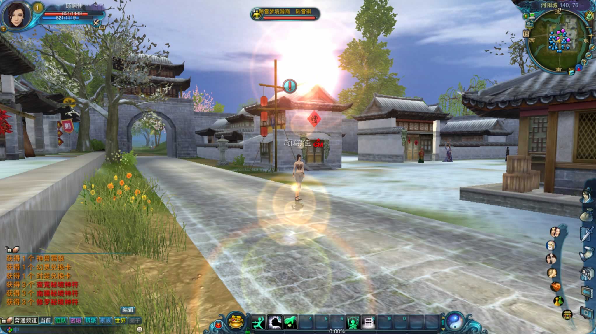 上线先去仙工处买个低级法宝带上,在一排NPC对面找小芳买个福利装备带上