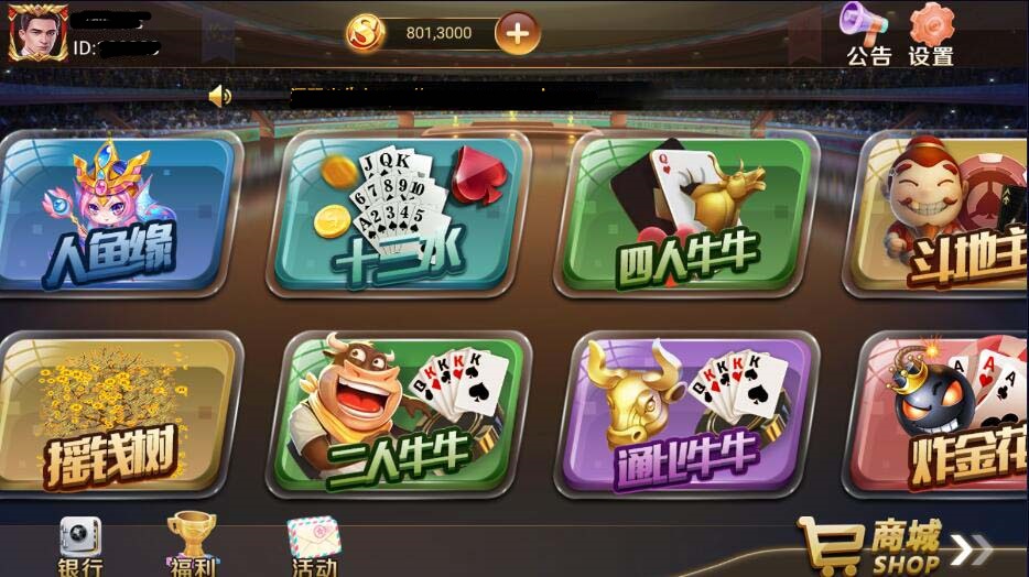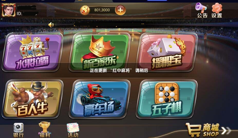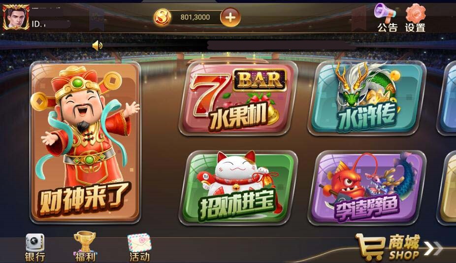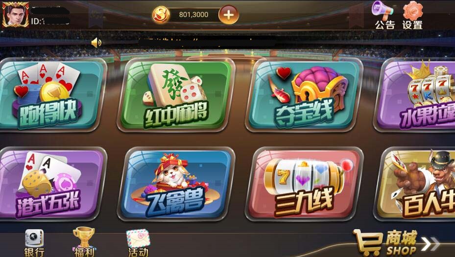 包含游戏:财神来了、水果机、招财进宝、李逵劈鱼、水浒传、人鱼缘、摇钱树、十三水、二人妞妞、四人妞妞、通比妞妞、斗地猪、炸金花、跑得快、港式五张、红中麻雀、飞禽兽、夺宝线、三九线、水果拉霸、百人牛、新白家乐、豪车场、摇*骰*宝、五子棋。