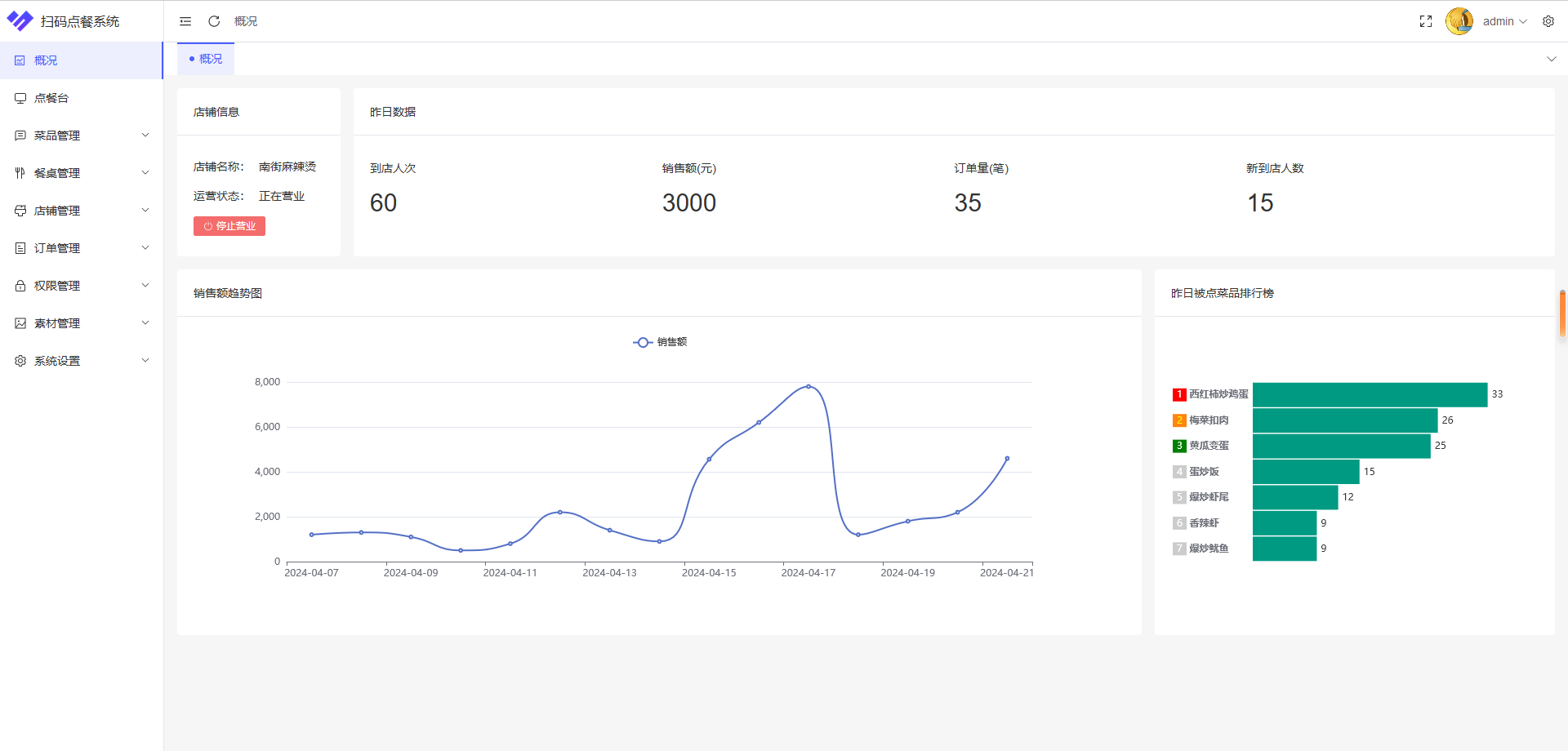 店铺数据统计:餐厅可以通过扫码点餐系统统计订单数据,包括销售额、菜品销量等。