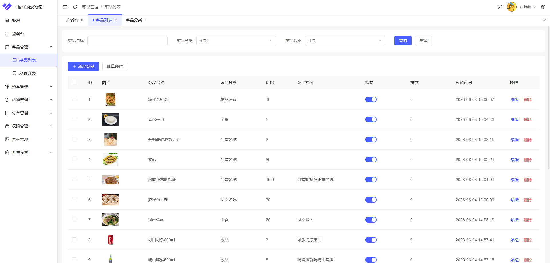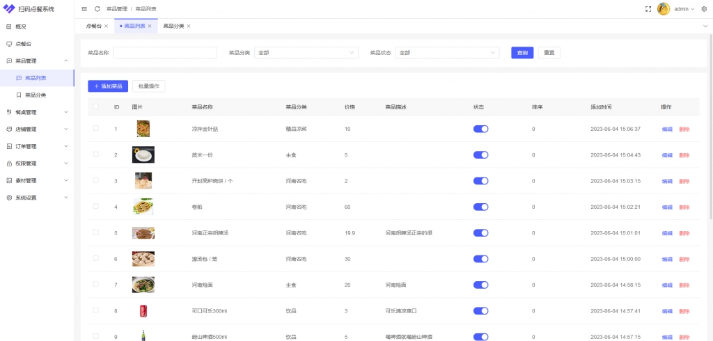 菜品管理:商户可以在管理端对店铺中的菜品进行管理,例如可以对菜品进行增加、修改和删除等功能。