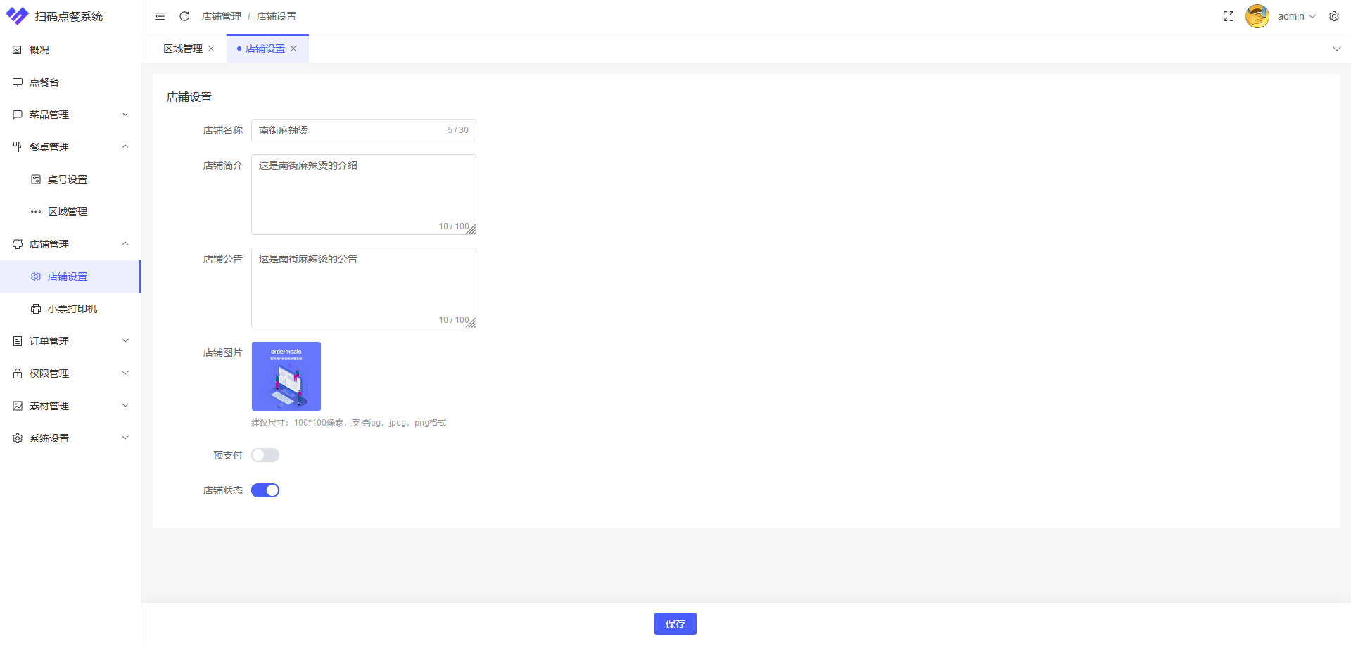 店铺设置:商户可以设置店铺的一些展示信息,例如店名、介绍、公告等信息。这些信息同时会展示在顾客点餐端。
