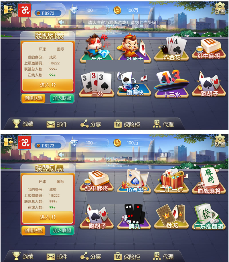 为加速网站,所有图片进行了优化处理,所以并不是高清,实际中游戏与网站本身画面是高清的,部分源码中打包有高清展示图片。棋牌源码网 » P149-无授权的五游大联盟-五洲联盟组件牌友联盟+视频教程