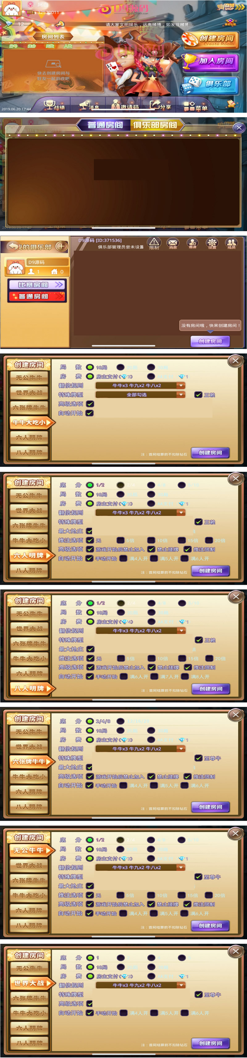 为加速网站,所有图片进行了优化处理,所以并不是高清,实际中游戏与网站本身画面是高清的,部分源码中打包有高清展示图片。棋牌源码网 » P279-九城牛妞房卡组件已修复可创建俱乐部带自动抽水+六种玩法模式版本