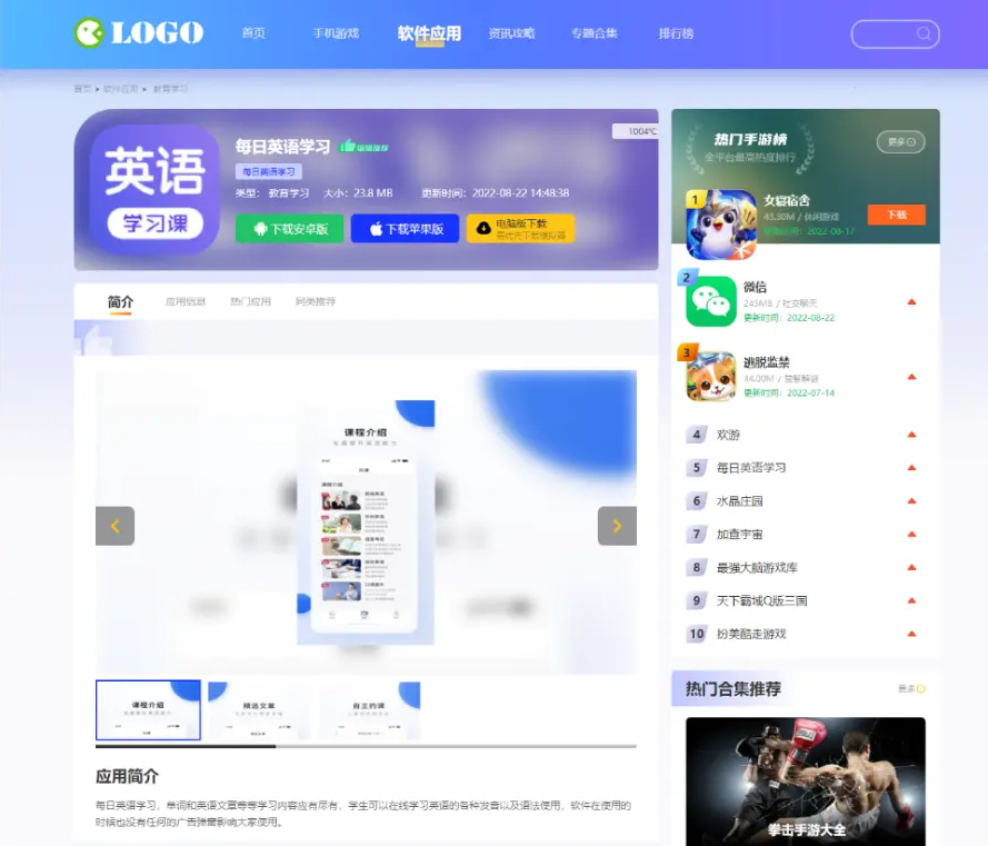 为加速网站,所有图片进行了优化处理,所以并不是高清,实际中游戏与网站本身画面是高清的,部分源码中打包有高清展示图片。棋牌源码网 » Q332-帝国CMS7.5手游应用下载站整站源码模板 | 简洁手机端模板下载