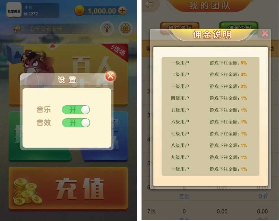 游戏为金币版百人妞妞,不是房卡版的。带强大的多级分销功能,支付已接codepay(码支付),这套源码网上应该不多见,看起来还是很不错的,没有授权,可以任意部署到其他的机器上。东西如下图,有喜欢的群友拿去测试吧!