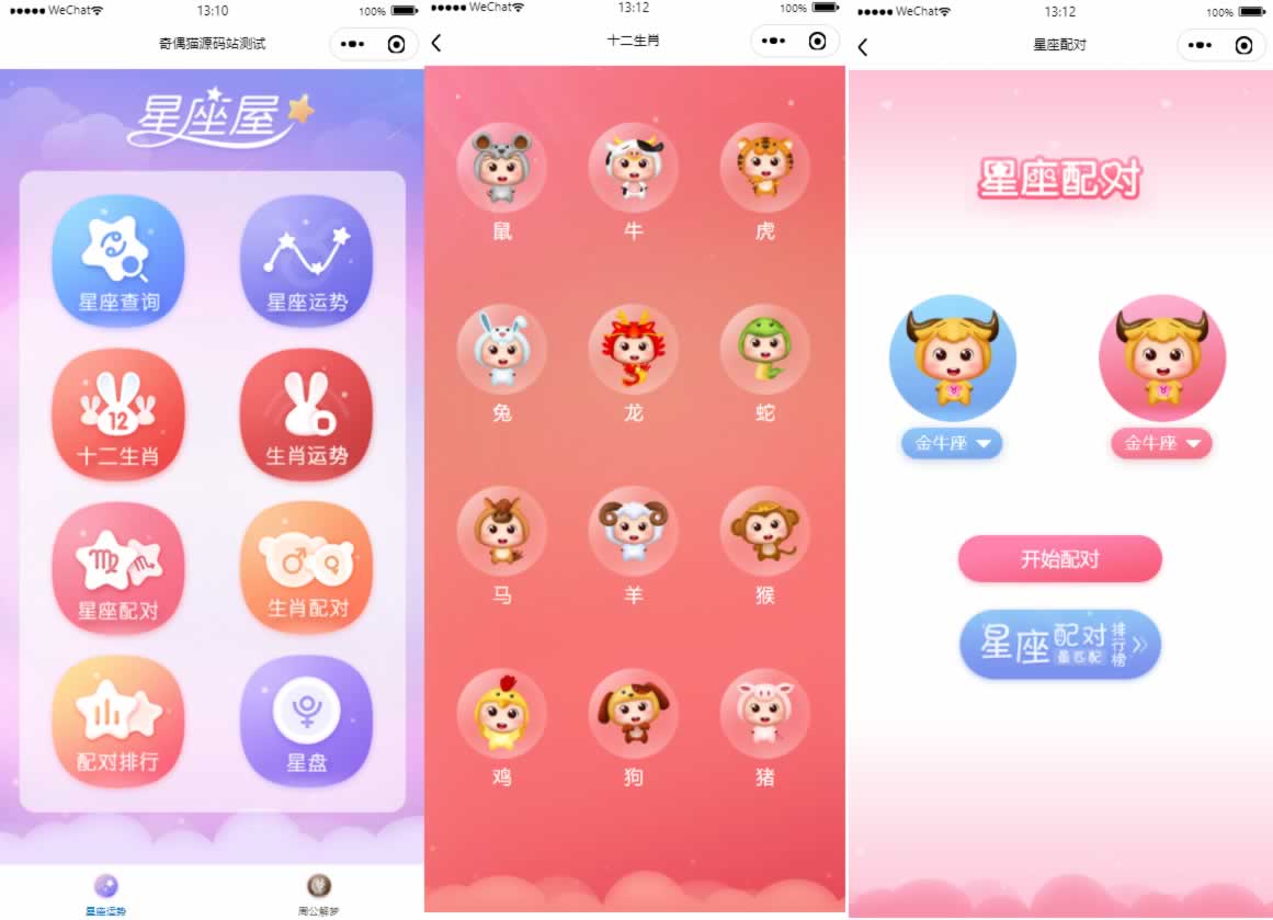 为加速网站,所有图片进行了优化处理,所以并不是高清,实际中游戏与网站本身画面是高清的,部分源码中打包有高清展示图片。棋牌源码网 » Q431–星座运势,周公解梦微信小程序/查询星座配对生肖配对