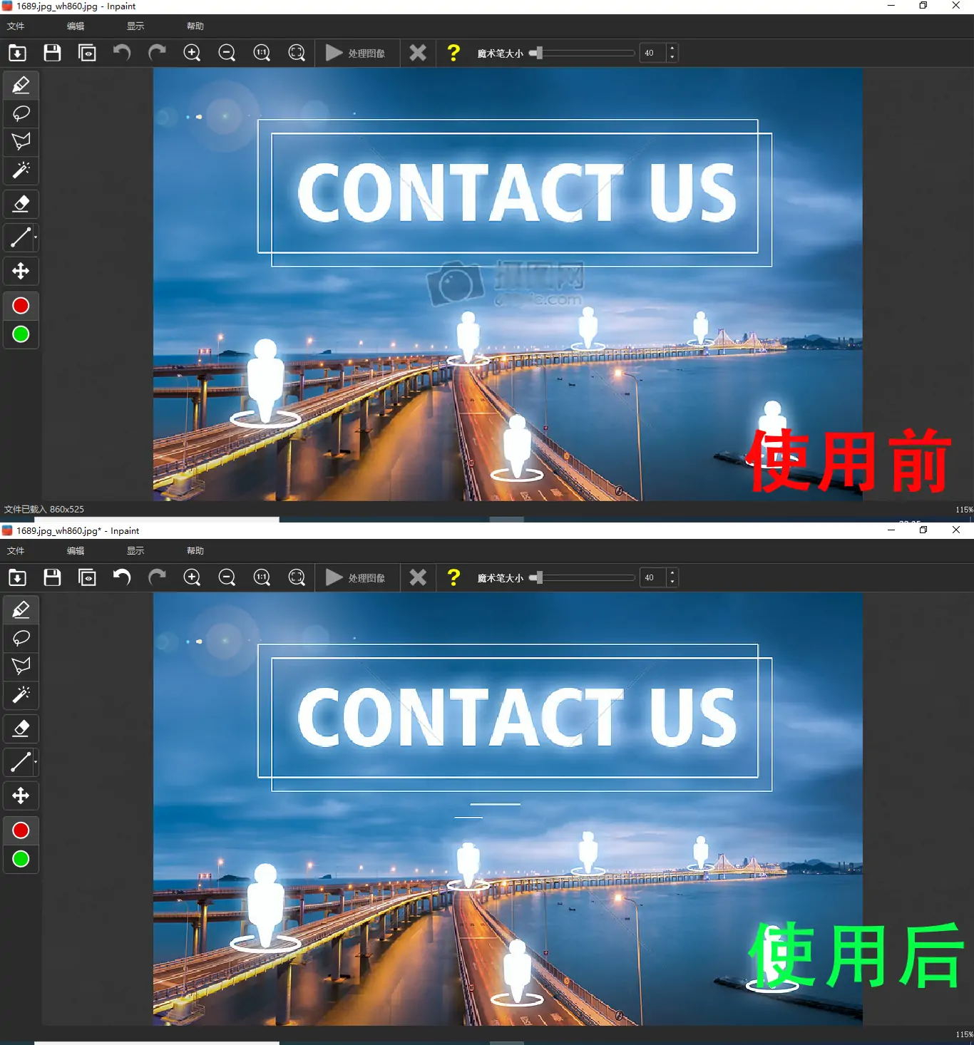 如果你的图片中有一些不满意的瑕疵,不必动用庞大PS来兴师动众,只需使用Inpaint即可轻松搞定。只需用它的“魔术笔”涂抹照片中需消除的对象,然后点击处理图像按钮即可神奇地让它完美消失。虽说是去水印工具,但利用它还可轻松地将图片中你觉得碍眼的任何物体变走,让您轻松摆脱照片上的水印、划痕、污渍、标志!它通过非常先进的图像识别算法,智能地将抹除后的区域补充回来,从而实现魔法般的效果。