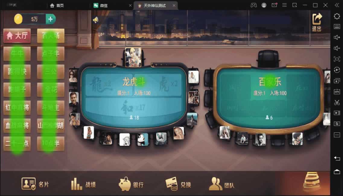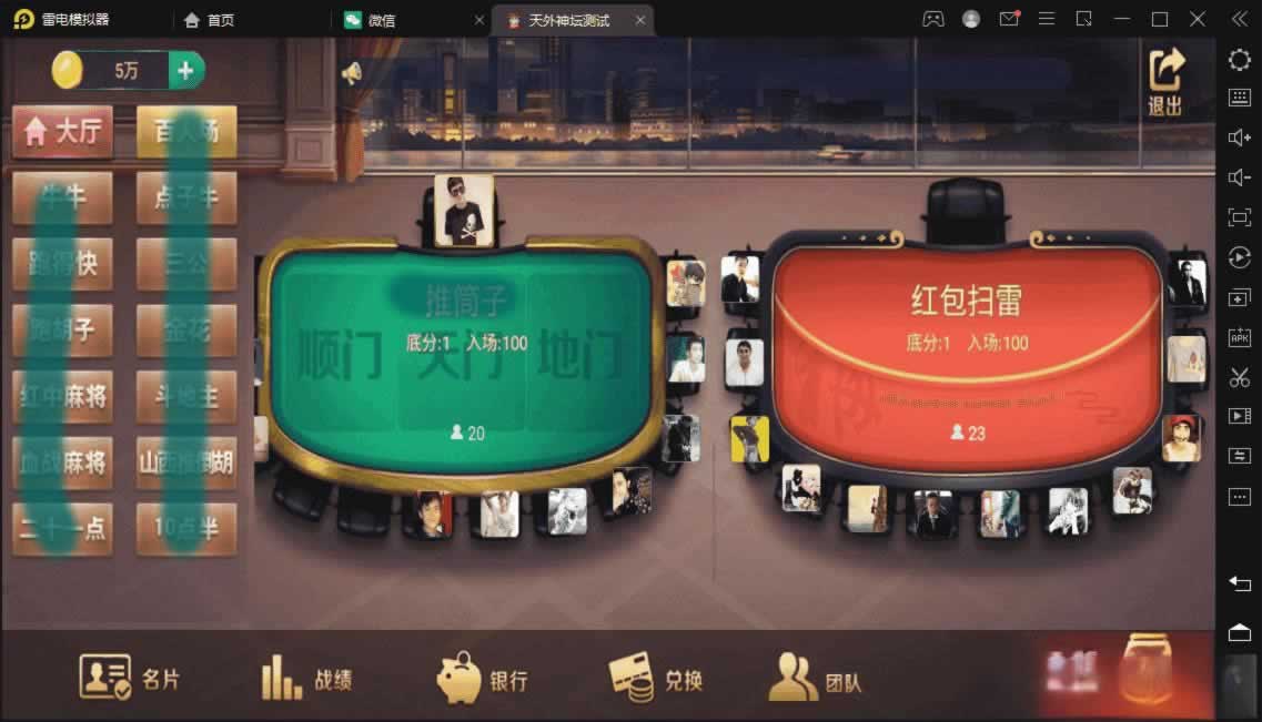 百人场有:百人牛妞,龙虎斗,败家乐,推筒子,红包扫雷