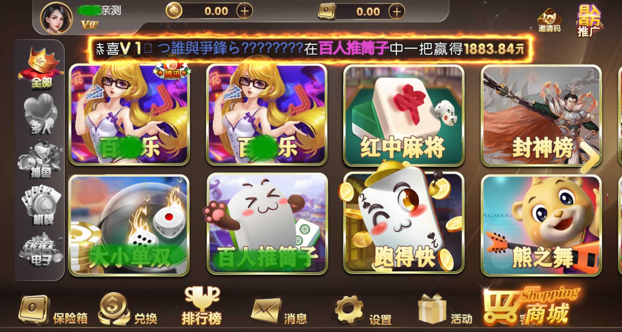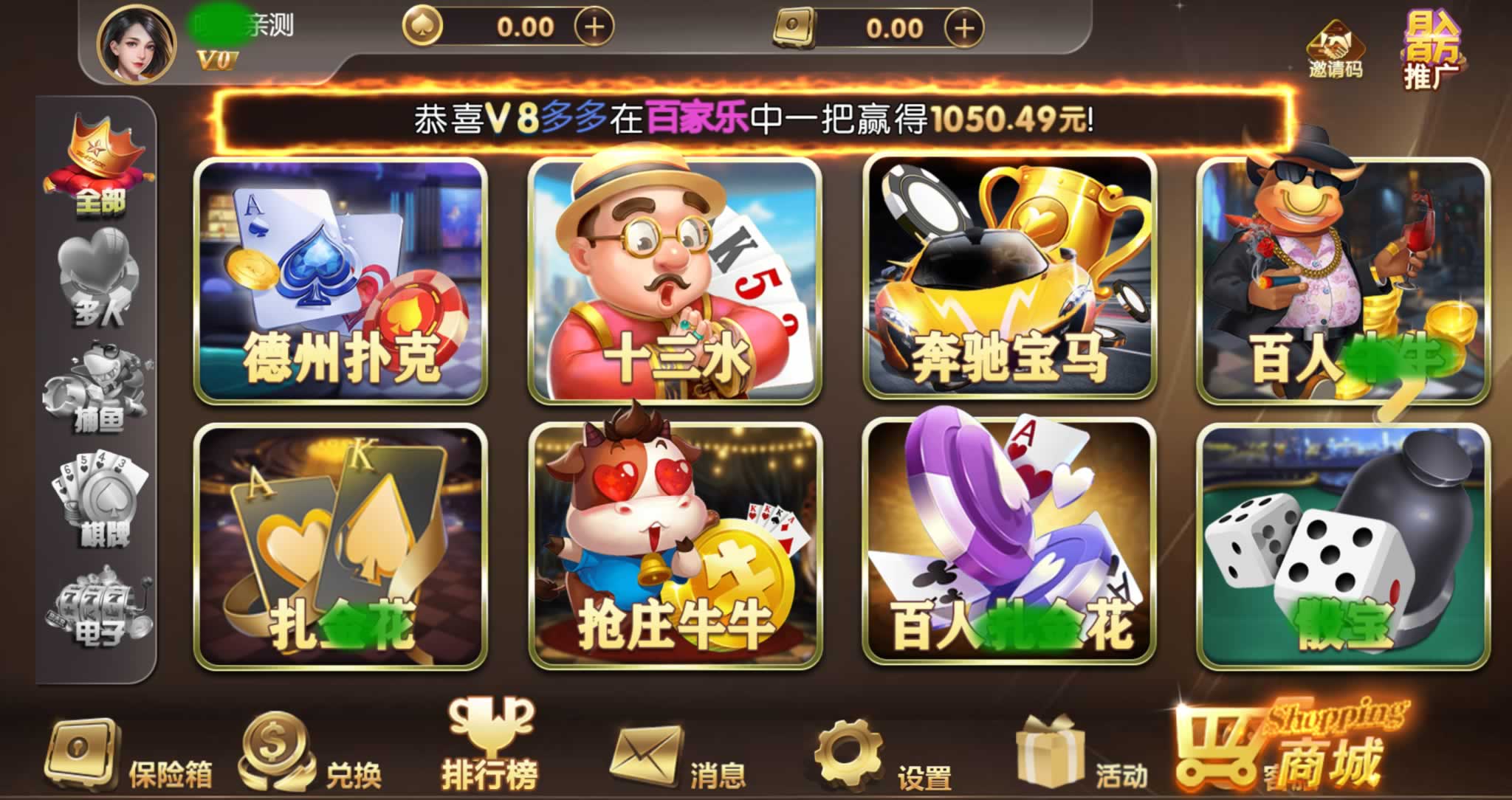 棋牌:德州扑克,十三水,斗地主,跑得快,轧金华,抢庄妞妞,红中麻酱,二人妞妞