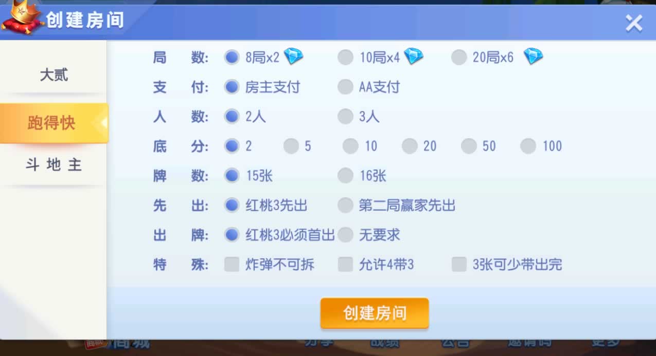 游戏玩法:跑得快,斗地主,长牌(改大贰),有控。