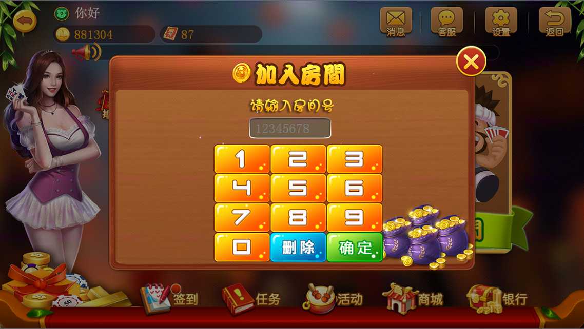 9款游戏包括:红中麻将,捕鱼,四人牛牛,德州扑克,斗地主,诈金花,百家乐,赛车风云,森林舞会。