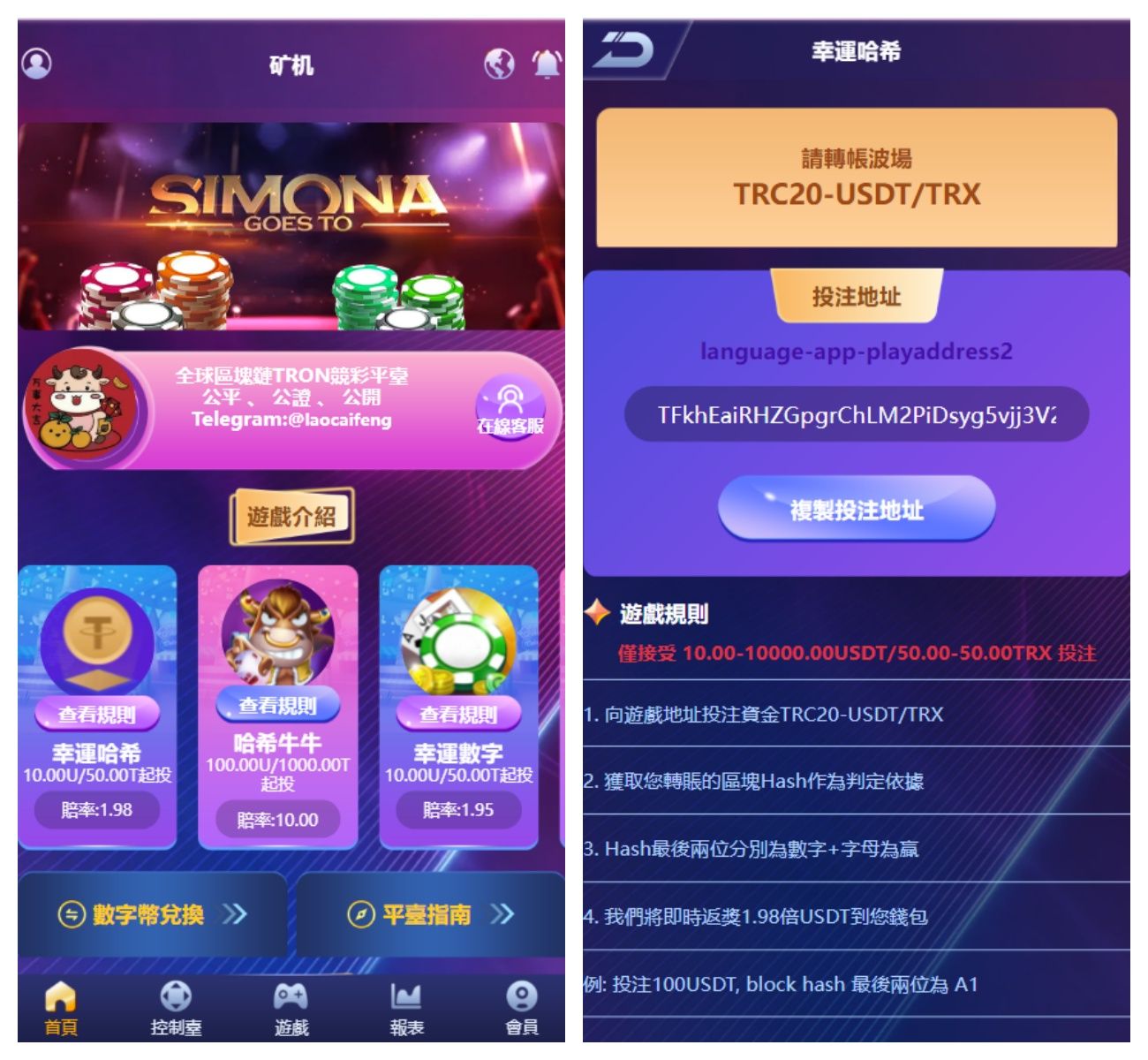 游戏有:幸运哈希、哈希牛牛、幸运数字、幸运庄闲、哈希PC10、哈希PK10 支持TRX兑换USDT功能。