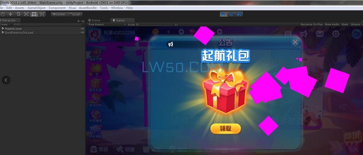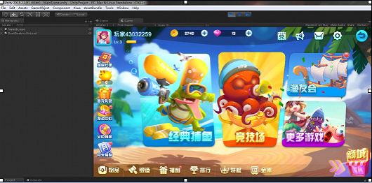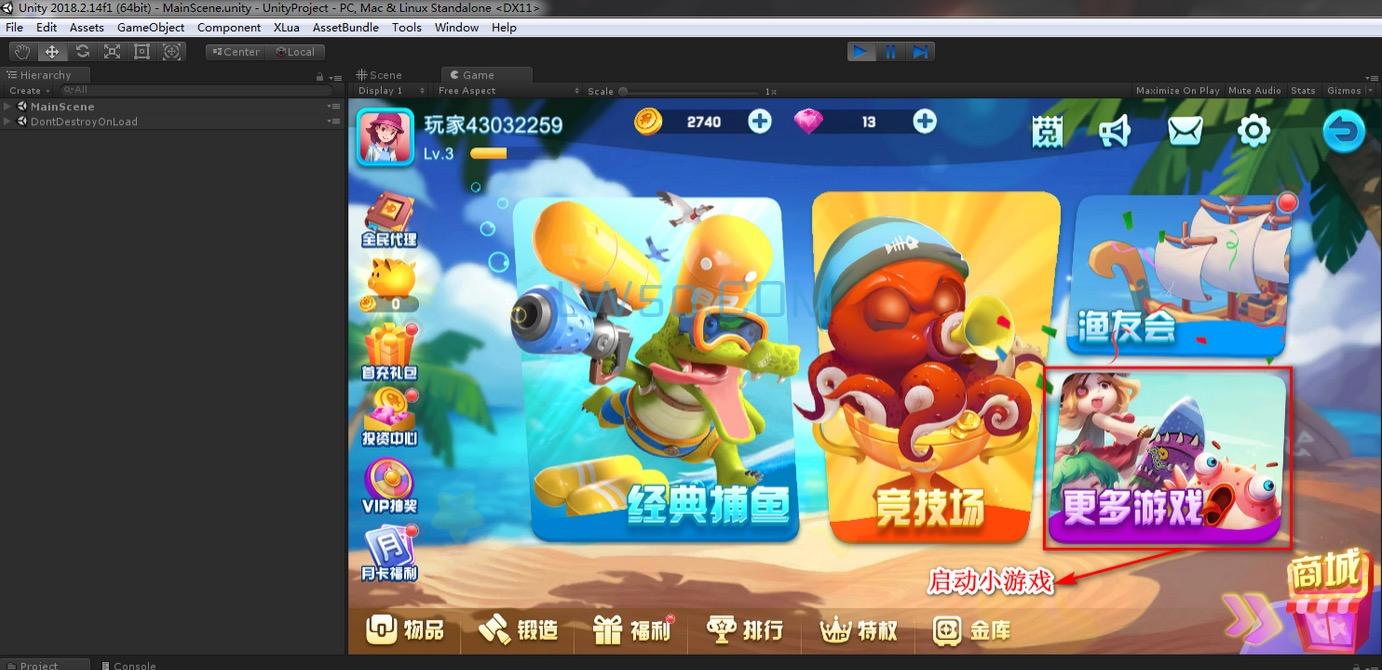 ① 全部修改设置完成后,打开游戏登录场景,启动客户端,游戏登录场景:LoginScene,然后在游戏主场景中启动小游戏。