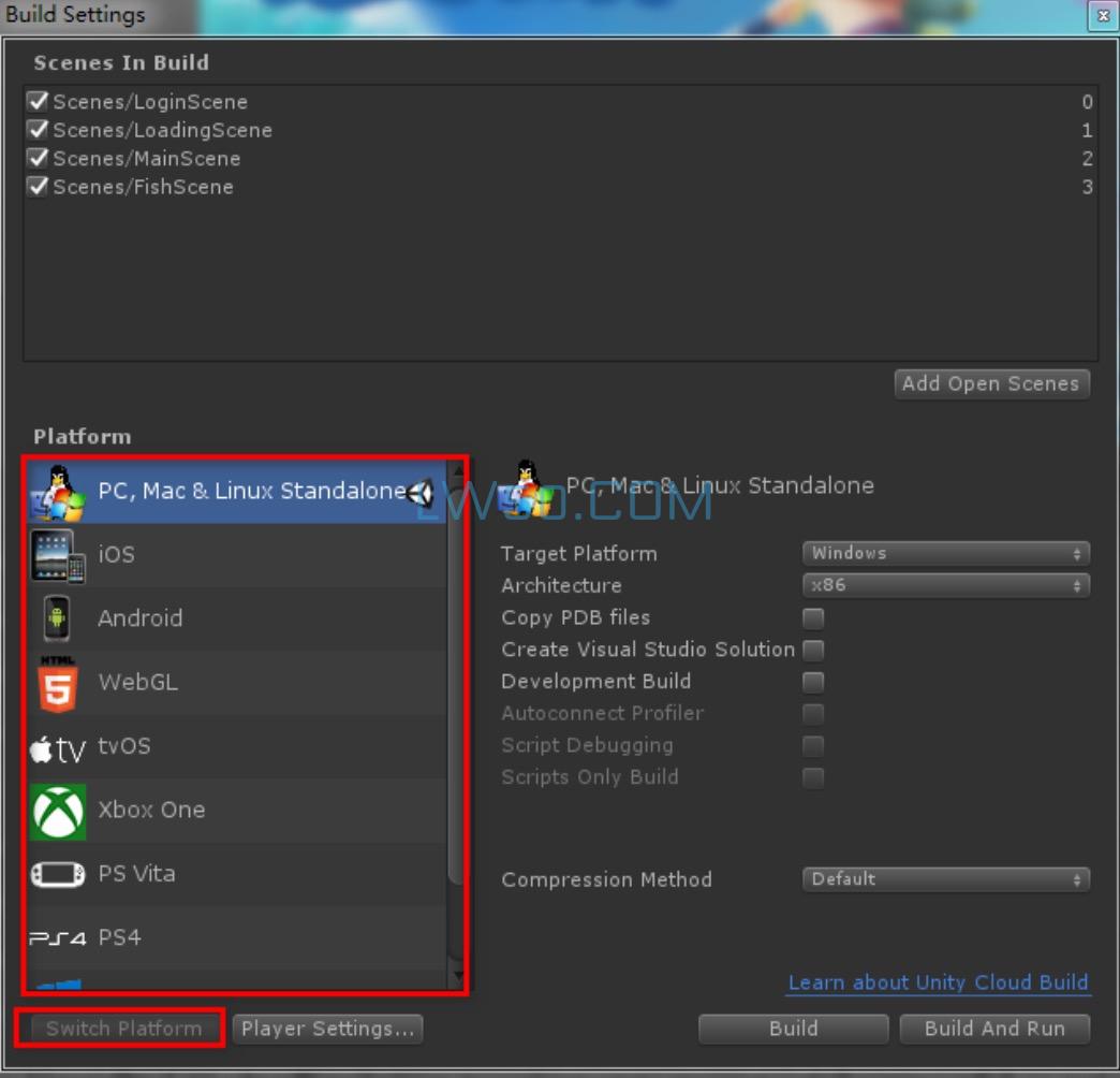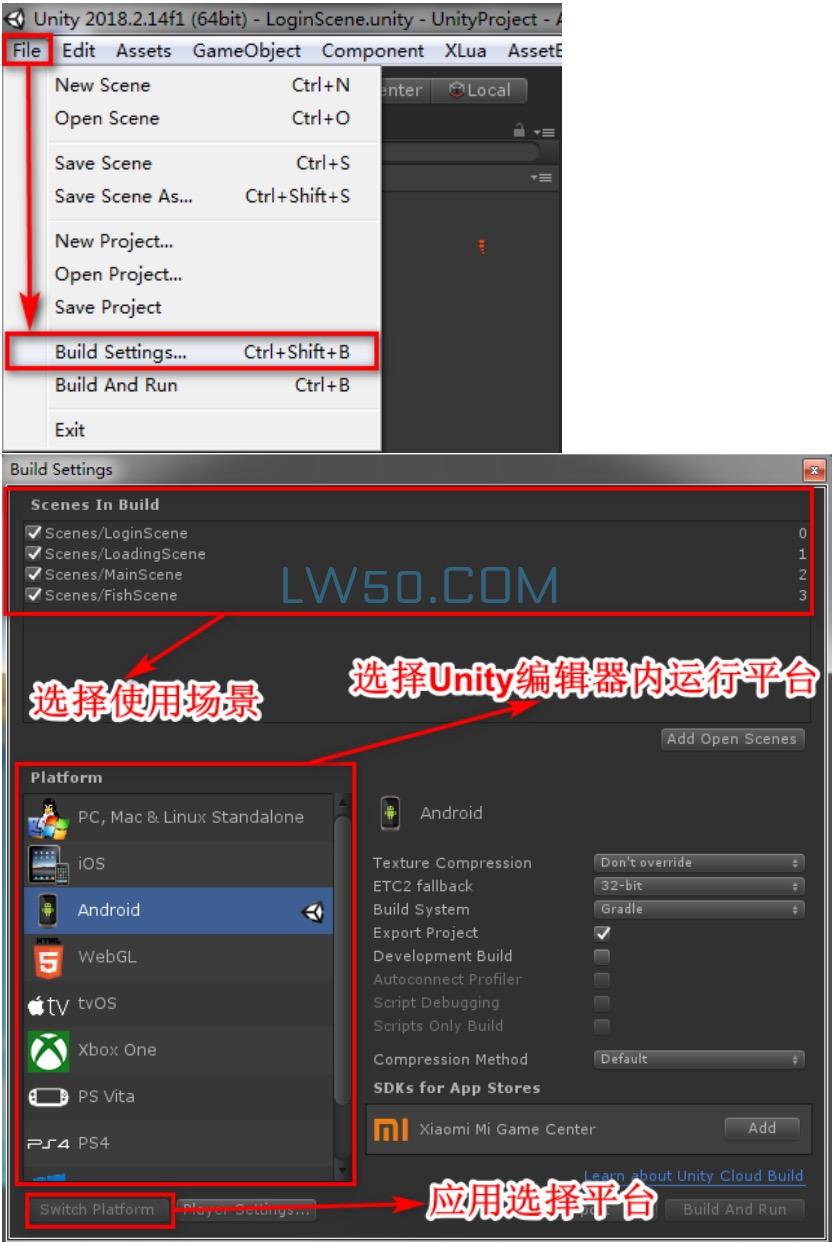 ① 在进行不同运行平台的热更新资源导出时,必须让Unity处于对应运行平台下。
