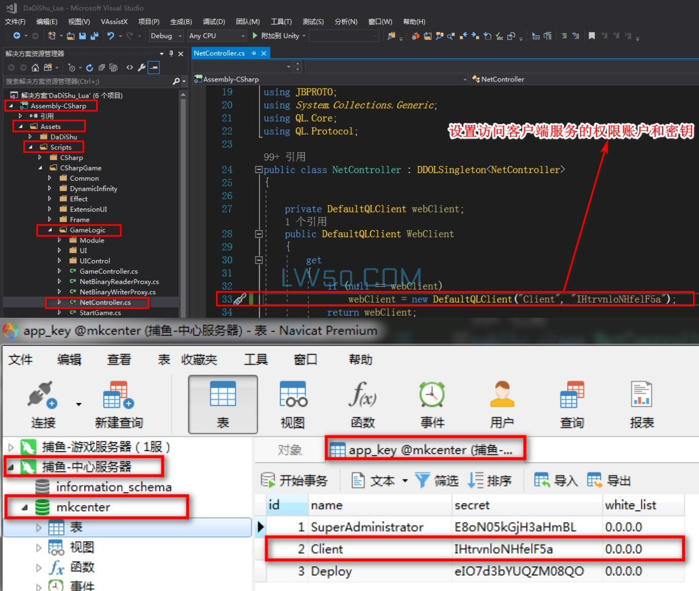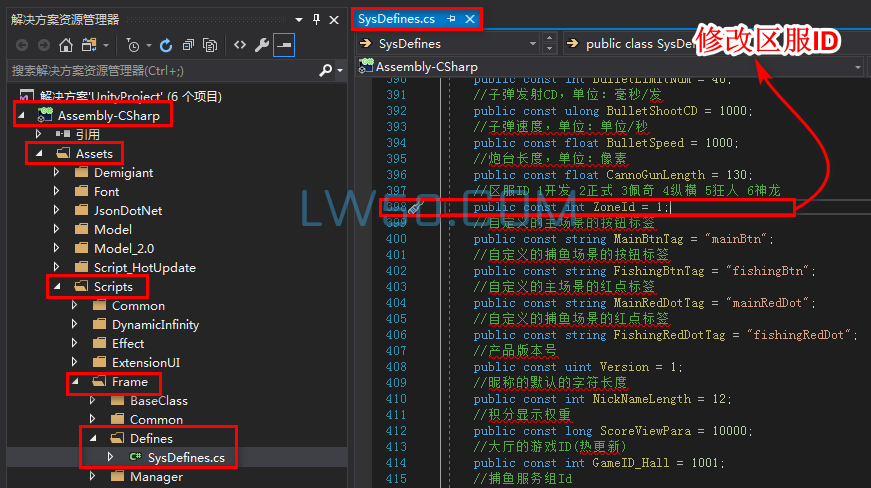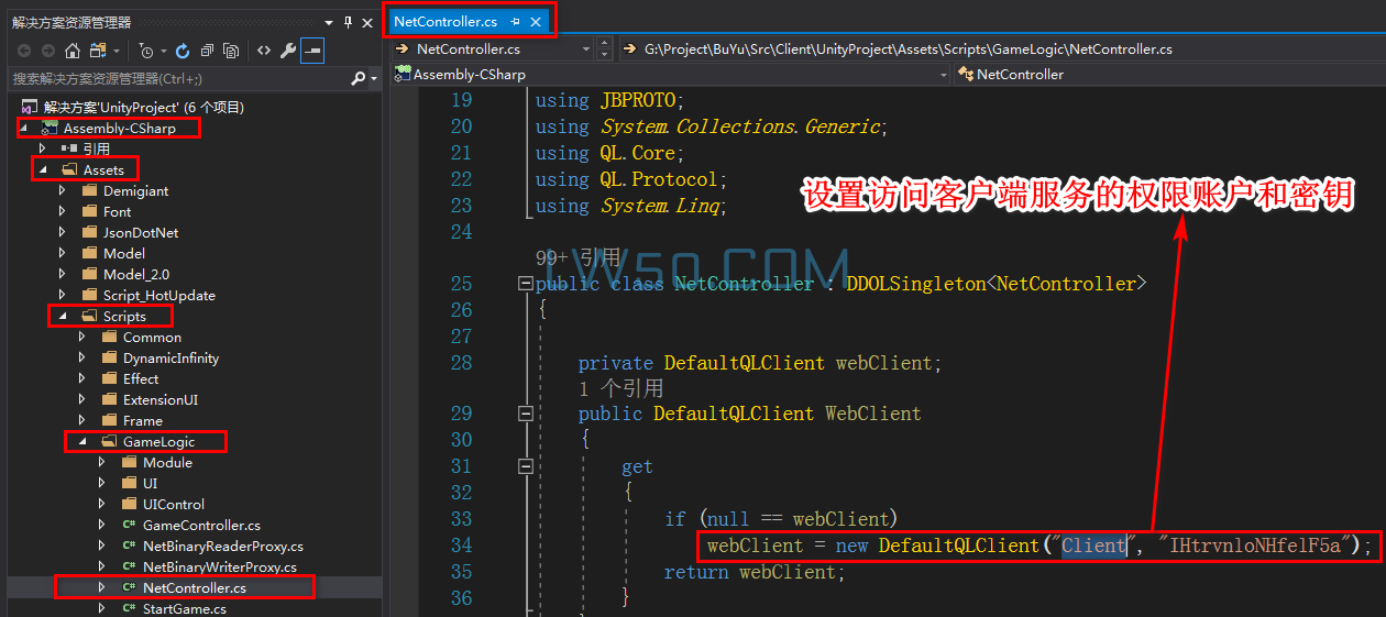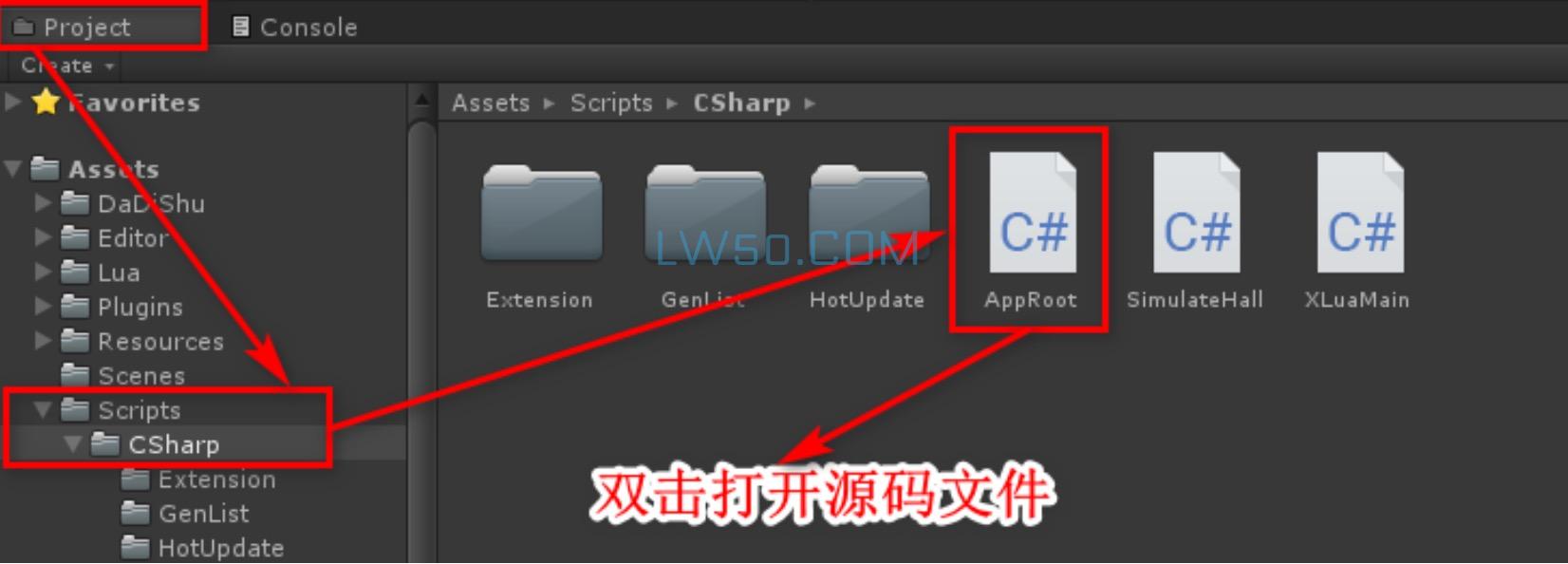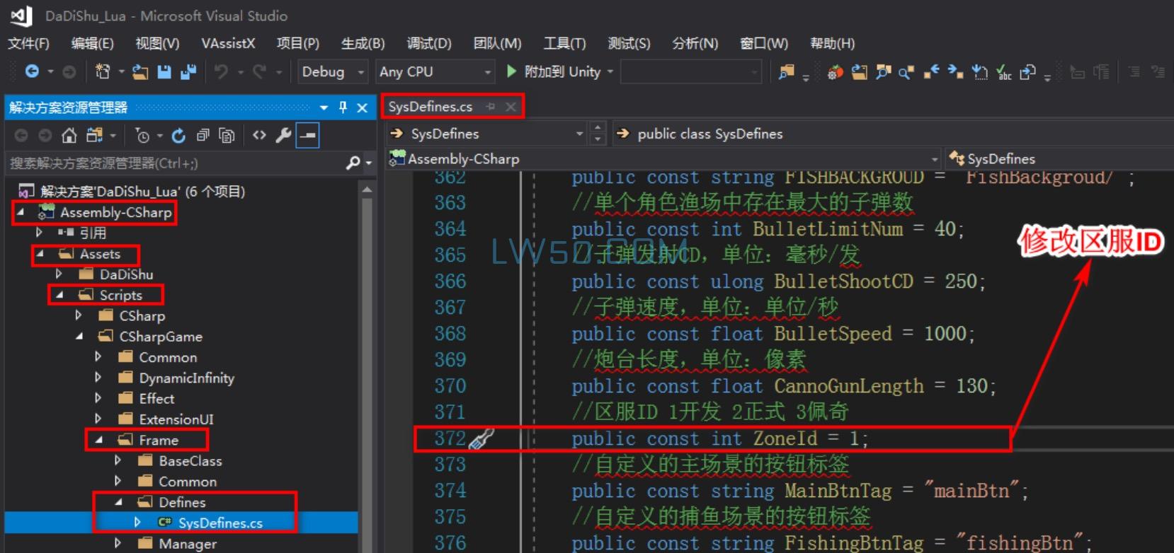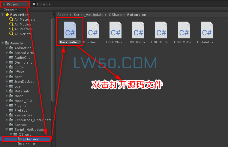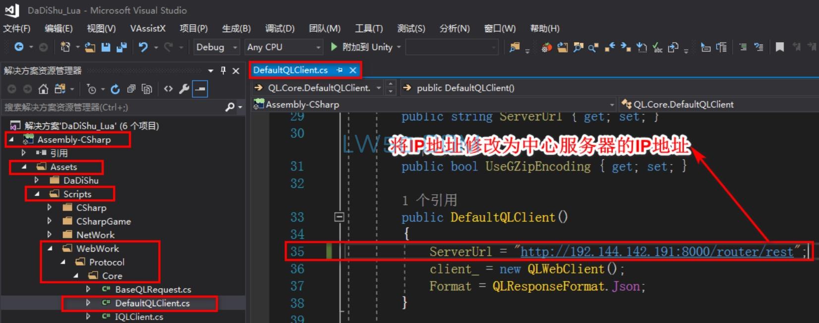 使用unity编辑器打开客户端unity工程,在Project视图中通过打开源码文件的方式打开客户端VS工程。