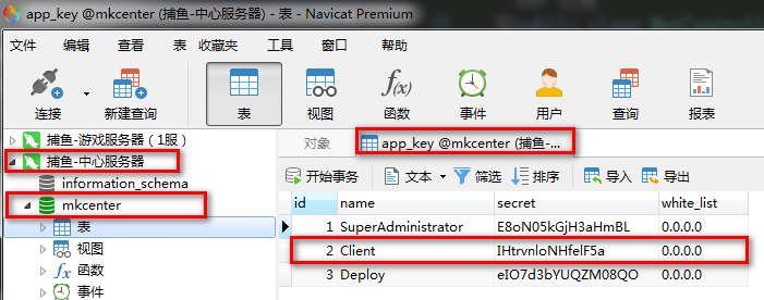 设置访问客户端服务的权限账户和密钥,相关信息在中心服务器数据库mkcenter子库里的app_key表中查看。