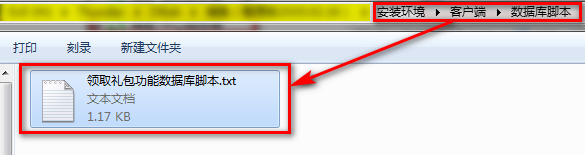 ② 脚本位置:安装环境\客户端\数据库脚本\领取礼包功能数据库脚本.txt