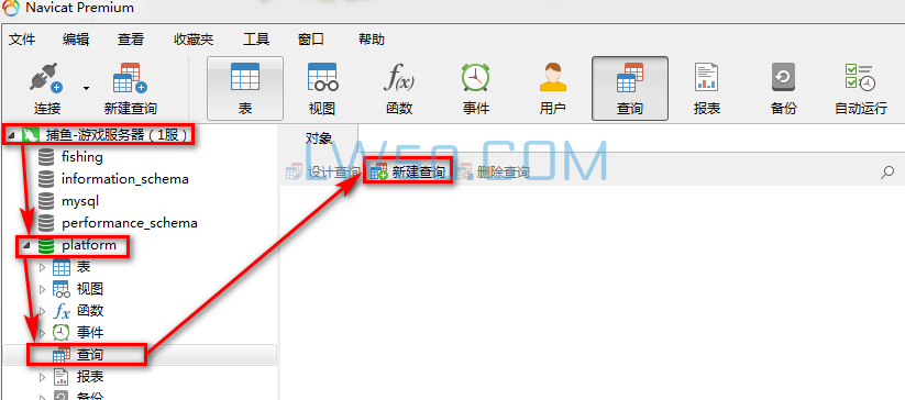 ③ 打开游戏服务器数据库platform子库,选择下面的查询,在查询界面选择新建查询。
