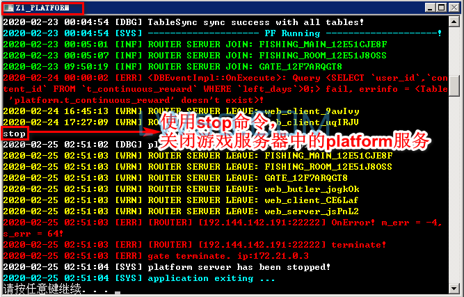 ⑥ 使用stop命令,关闭游戏服务器中的platform服务。