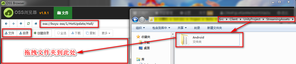 ⑦ 将导出到StreamingAssets目录下的对应运行平台热更新资源目录上传到OSS对应路径下,如上图。