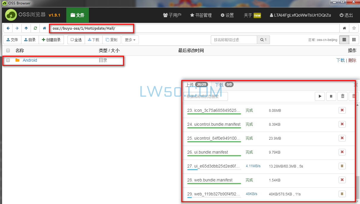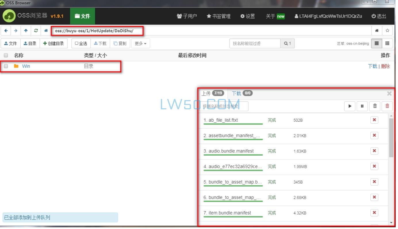 ① 按照以下步骤操作,上传客户端热更新资源至OSS。