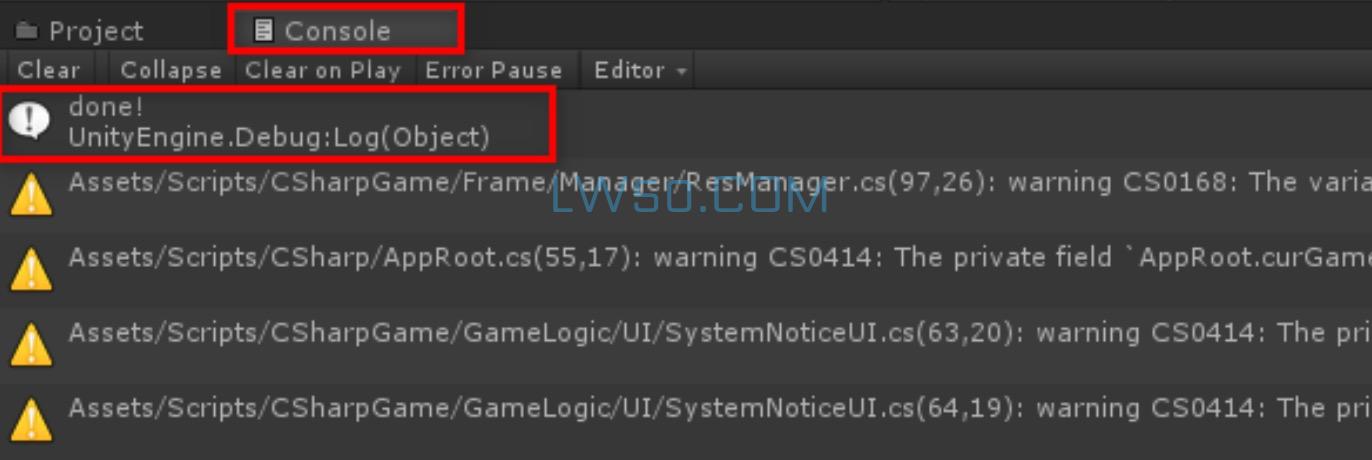 ④ 导出完成后,在Unity的Console窗口下会输出done!