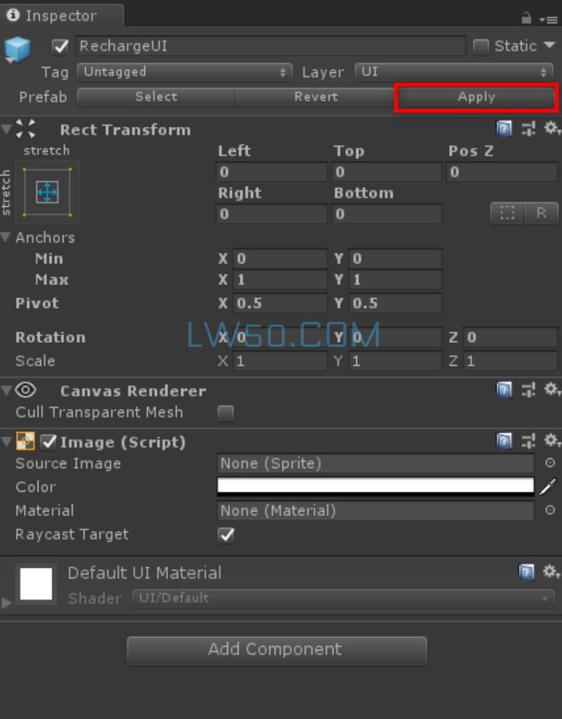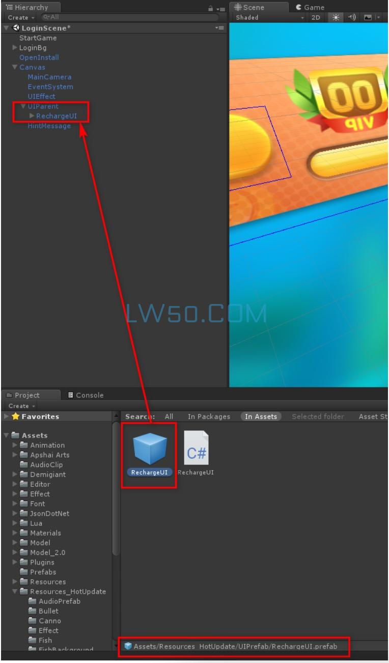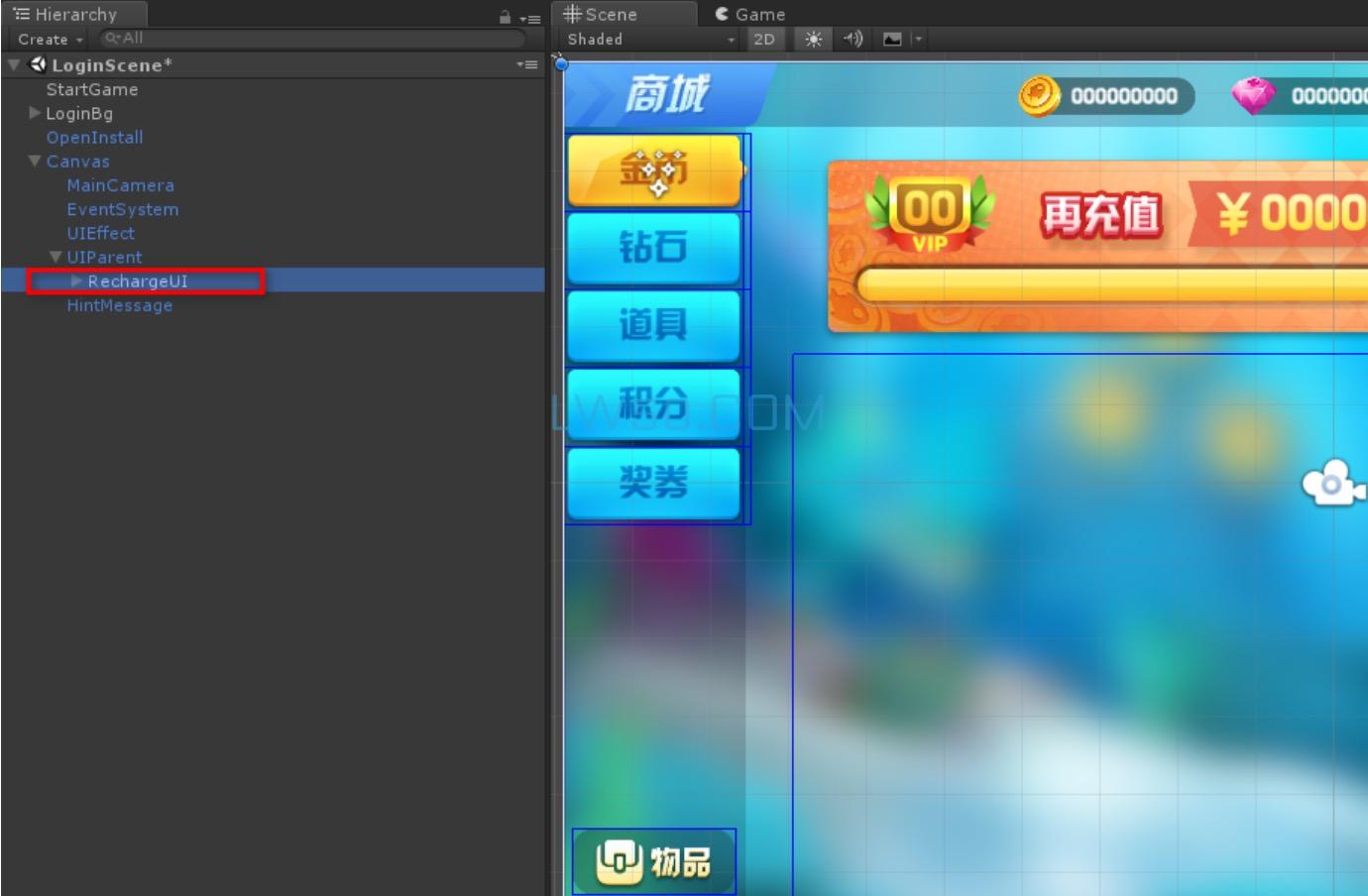 ② 将节点RechargeUI拖拽到场景管理器中Canvas下的子节点UIParent内。