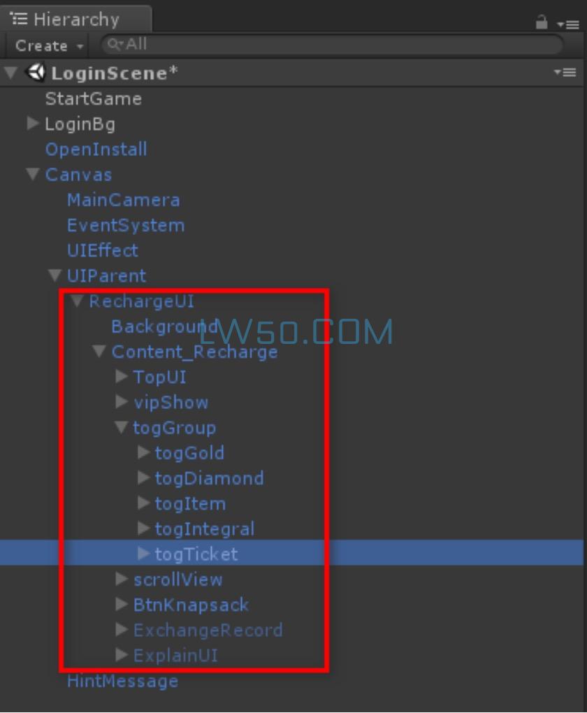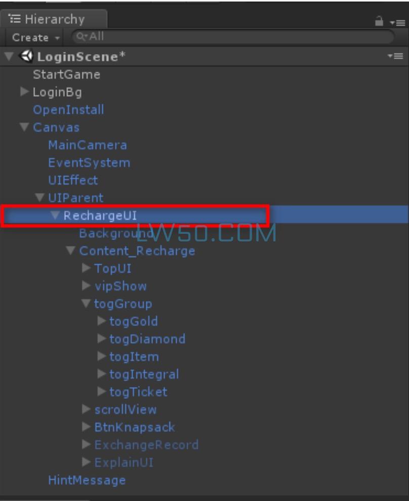 ③ 展开RechargeUI节点,找到下面的子节点togTicket。