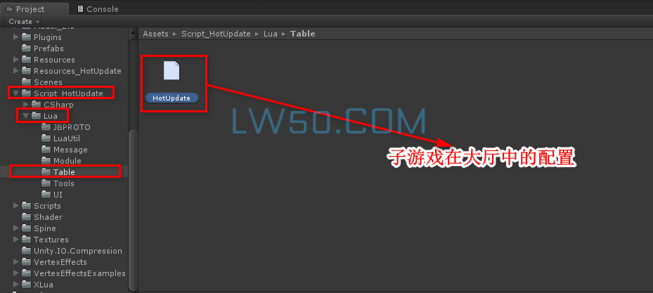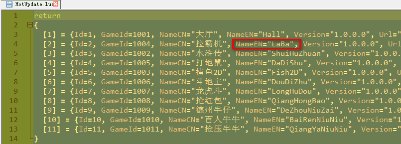 子游戏在大厅中的配置是在Src\Client\UnityProject\Assets\Script_HotUpdate\Lua\Table目录下HotUpdate.lua文件。