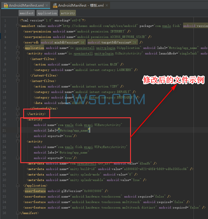 ② 打开AndroidManifest – 模板.xml文件,将上图中的红框部分,复制到生成的默认文件AndroidManifest.xml中,并修改安卓包的名称(android:name)。