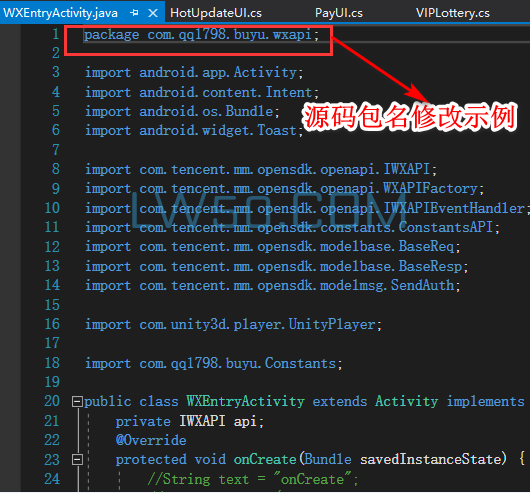 ③ 在Unity工程中,有关安卓端接收Java的微信回调相关源码文件中,也要将安卓包的名称设置为与Unity工程中设置的包名保持一致。