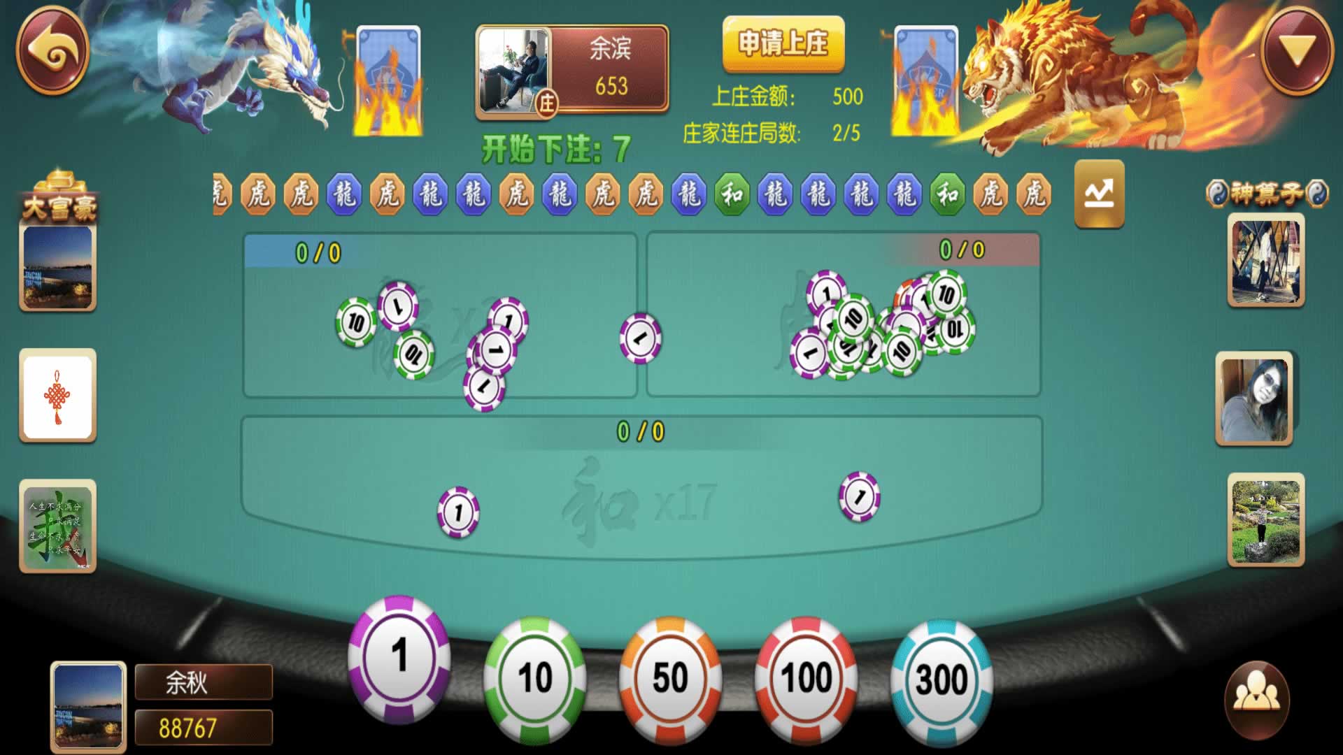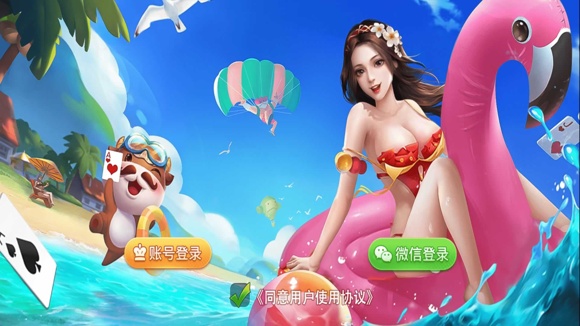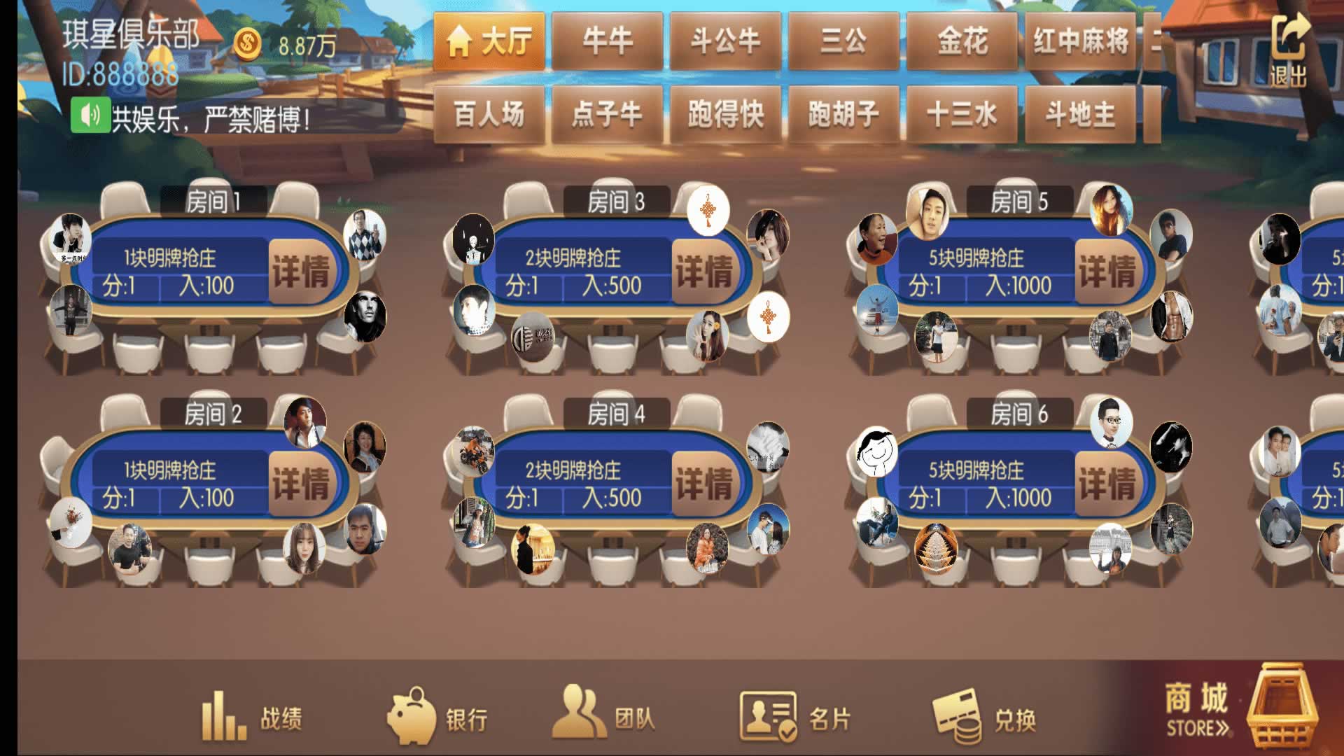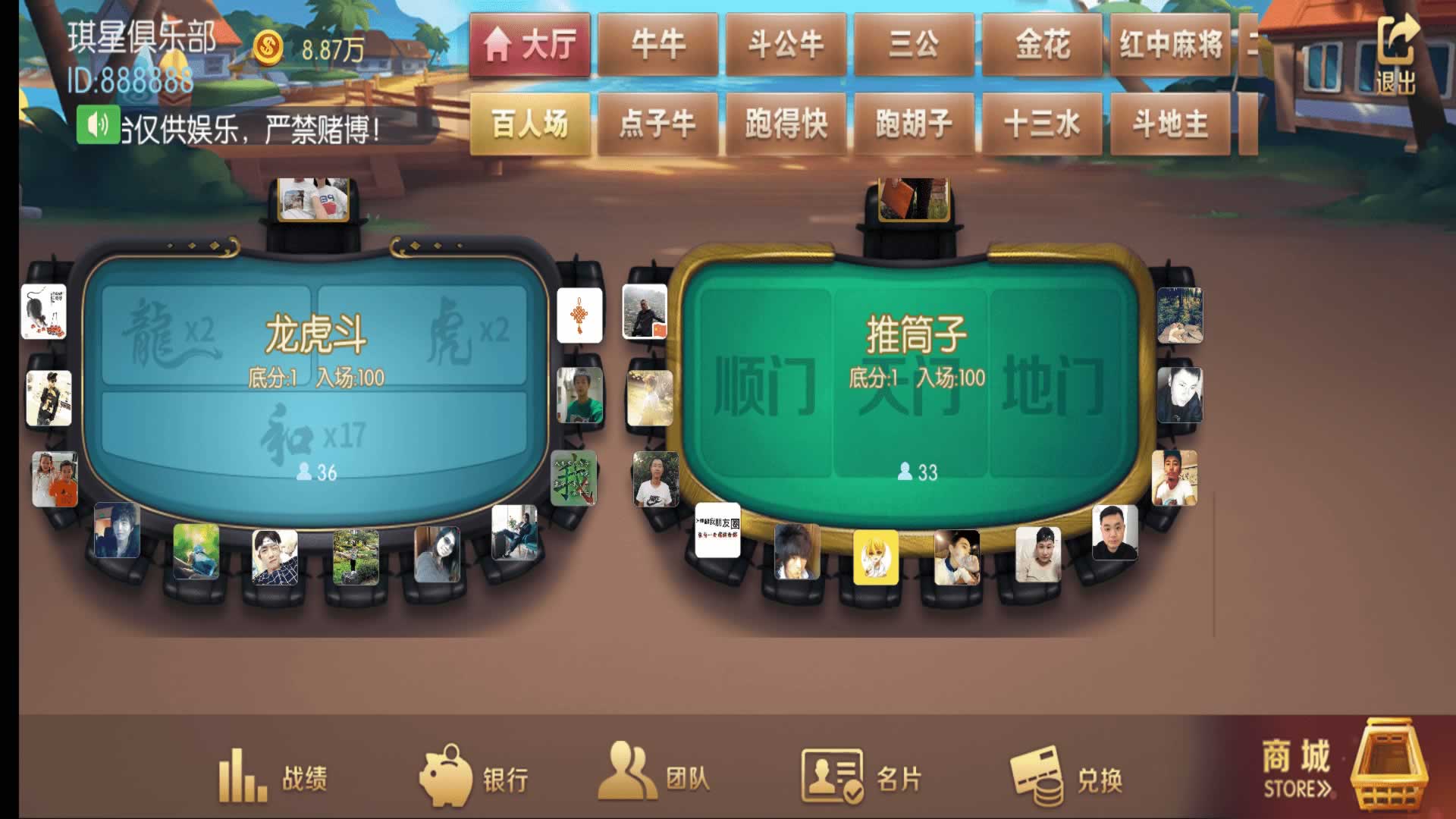 内含游戏:德州扑克、牛牛、斗公牛、跑得快、三公、扎金花、十三水、红中麻将、斗地主、血战麻将、山西推倒胡、点子牛、百人场里有龙虎斗、百家乐、推筒子、红包扫雷