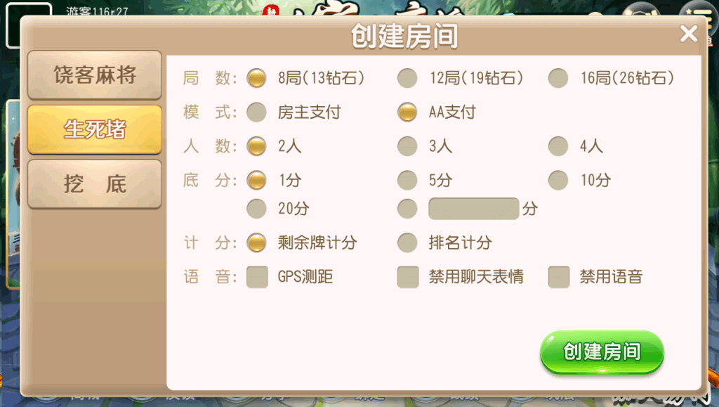 创胜系列/新饶客自家人麻将/亲友圈房卡棋牌组件 包含游戏:饶客麻将、生死猪、挖底
